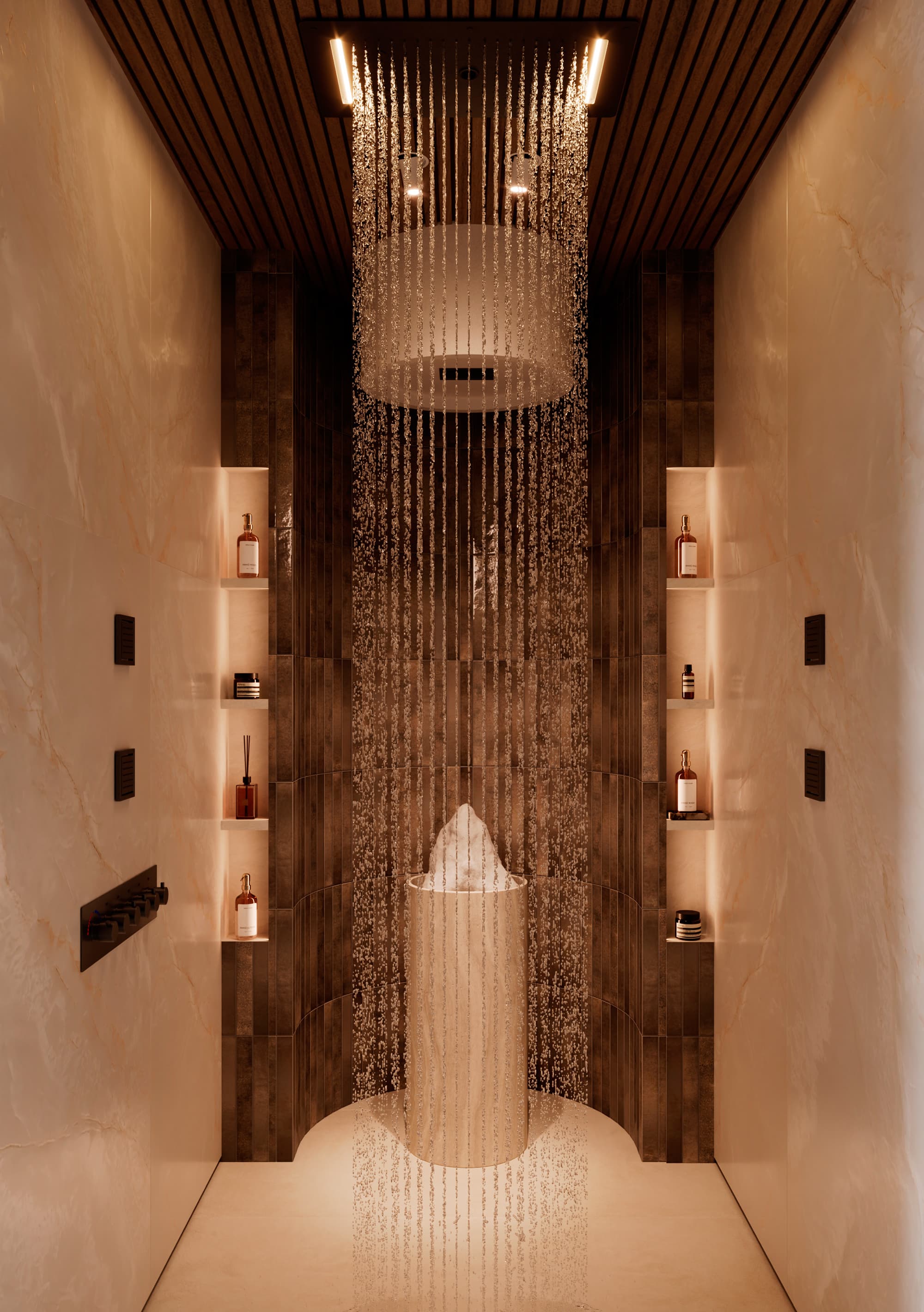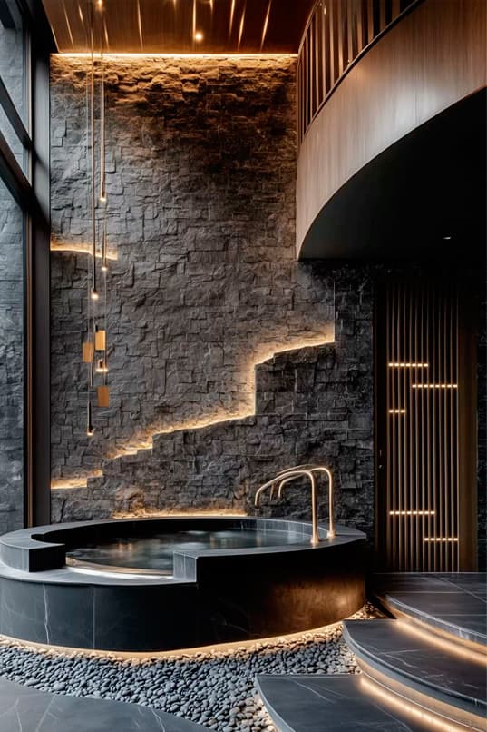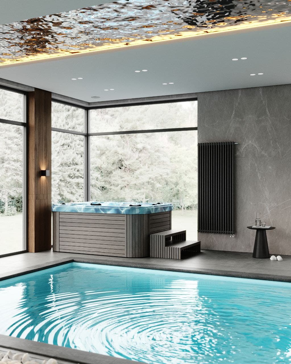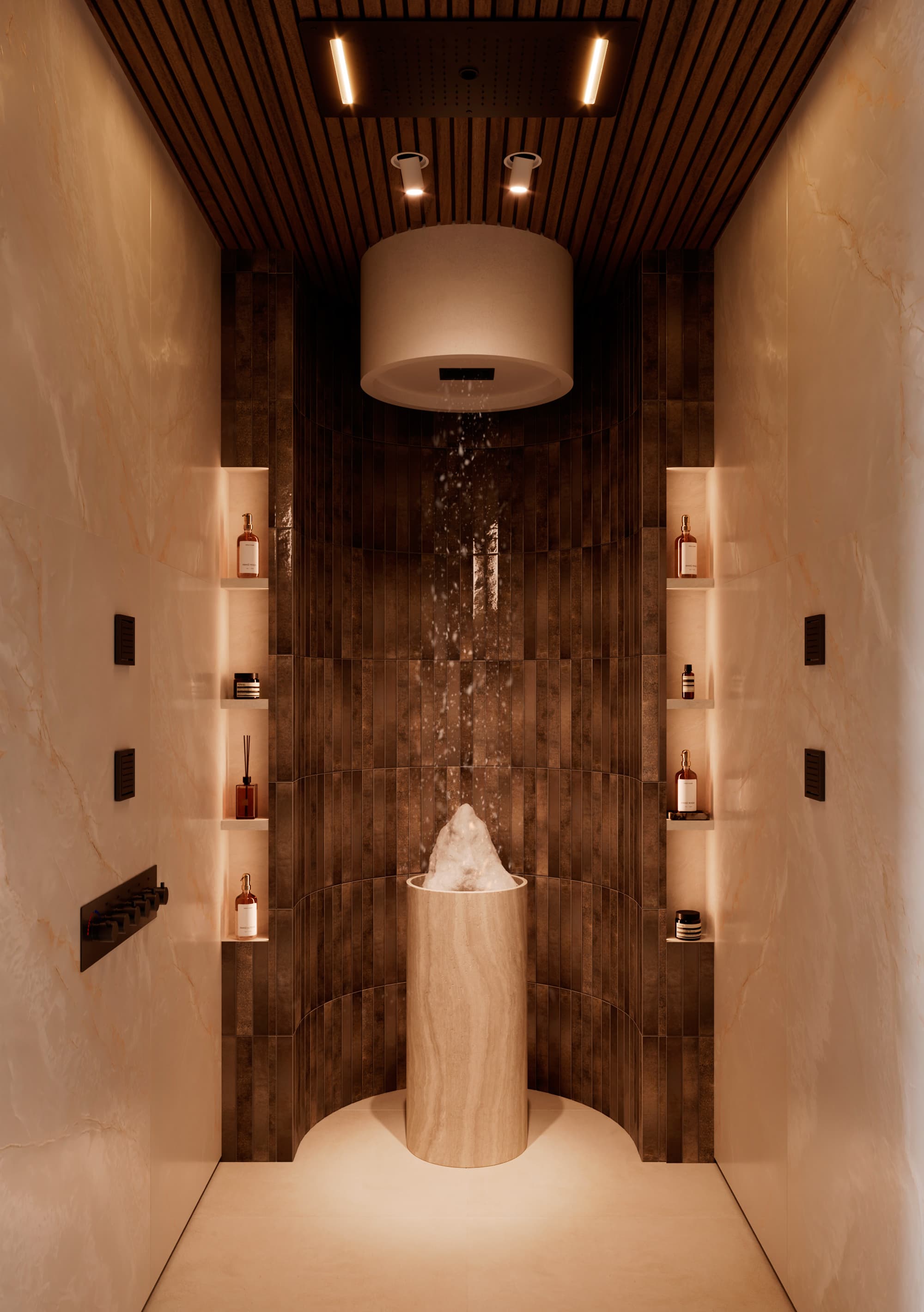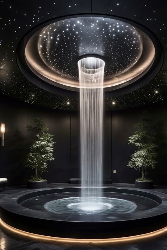 Ледяные купели, используемые для контрастных процедур, прекрасно помогают в восстановлении после горячих процедур. Спа-бассейны и гидромассажные ванны не только расслабляют, но и способствуют приятному отдыху, поднимая настроение и создавая идеальные условия для восстановления сил. Их проектирование должно учитывать удобное расположение и возможность наилучшего взаимодействия с другими зонами СПА. - Эмерсивный душ впечатлений