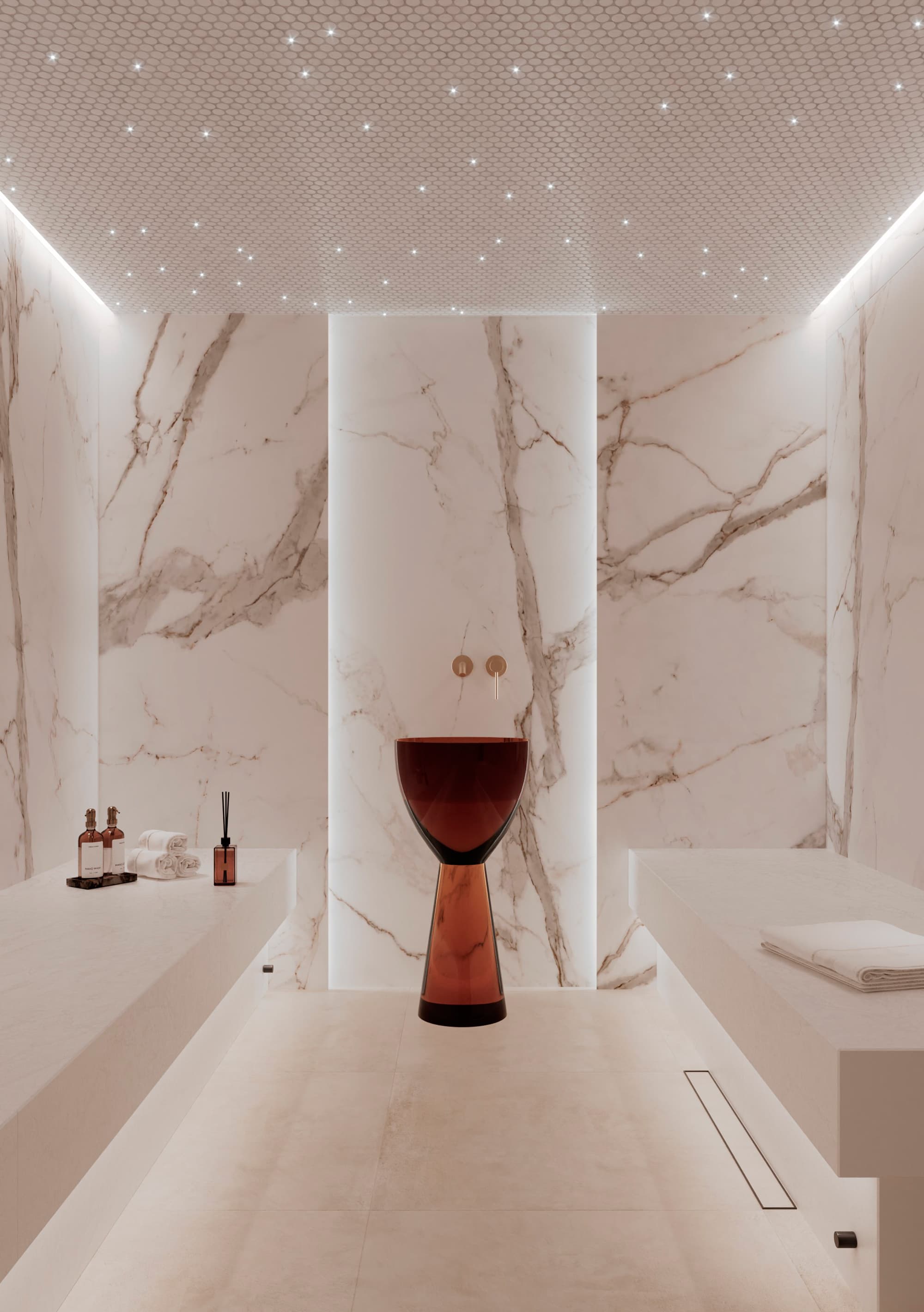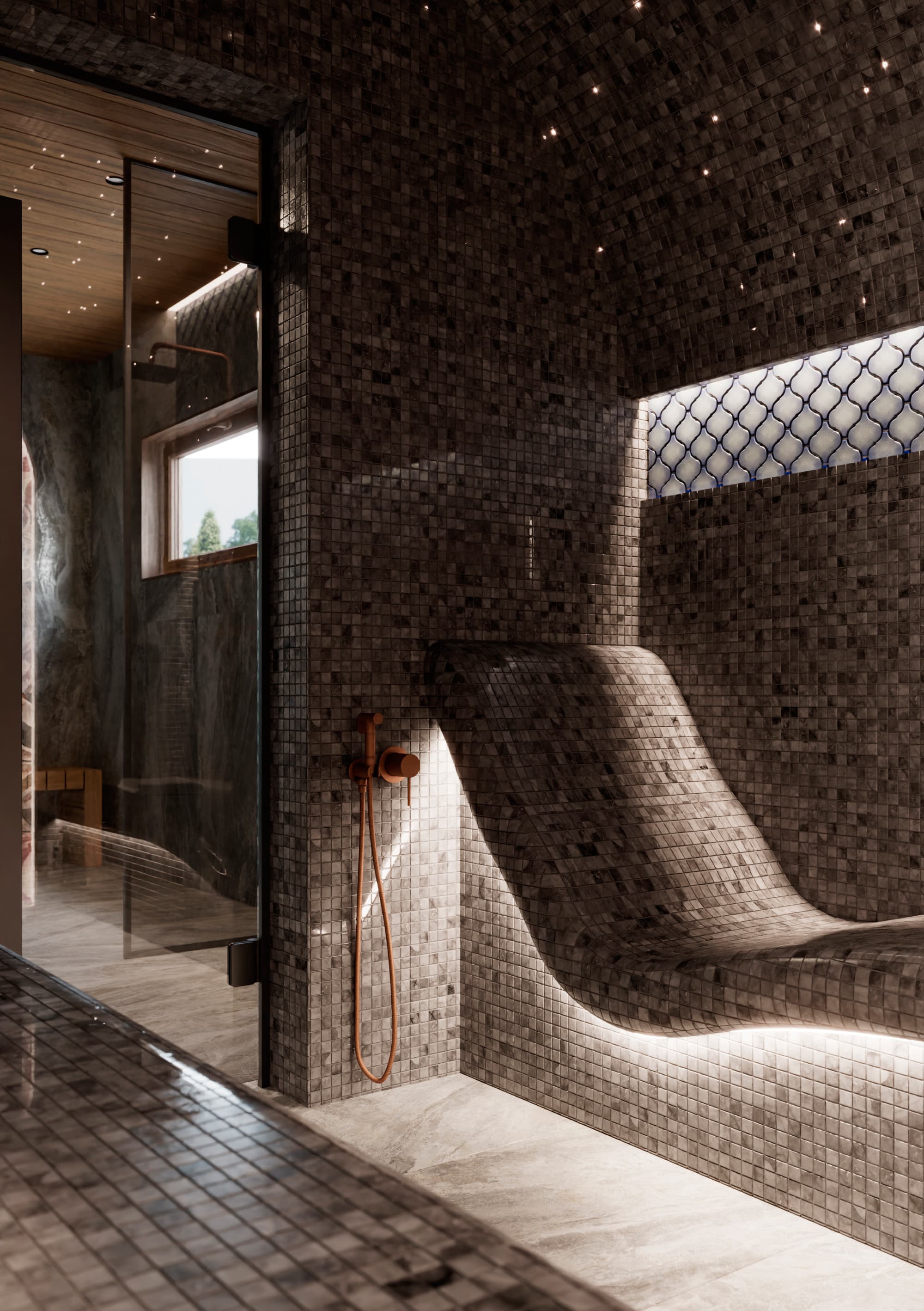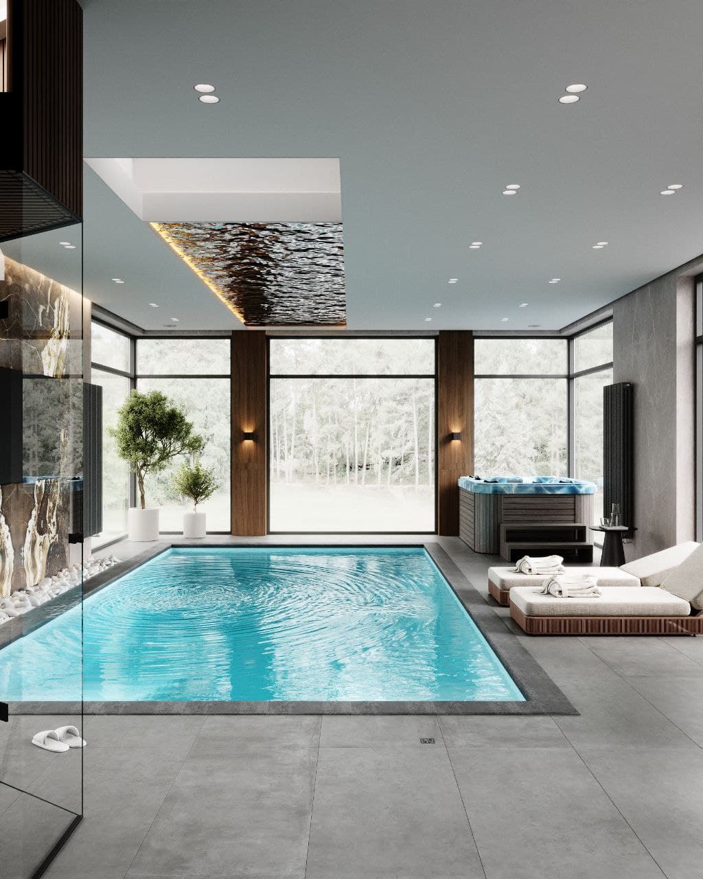 Ледяные купели, используемые для контрастных процедур, прекрасно помогают в восстановлении после горячих процедур. Спа-бассейны и гидромассажные ванны не только расслабляют, но и способствуют приятному отдыху, поднимая настроение и создавая идеальные условия для восстановления сил. Их проектирование должно учитывать удобное расположение и возможность наилучшего взаимодействия с другими зонами СПА. - Эмерсивный душ впечатлений